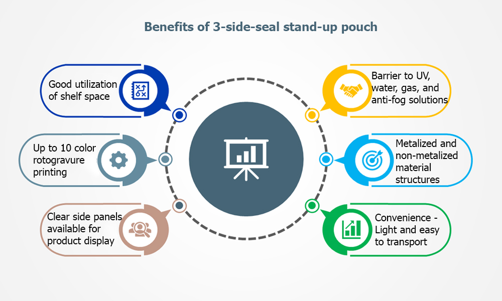 A 3 side-seal stand-up pouch is a type of 3 side-seal that gets its name from the bottom part. The bottom sole is stretched flat and allows it to stand upright when the bag is full. When the bag is empty, the base collapses so that the bag lies flat and saves space.