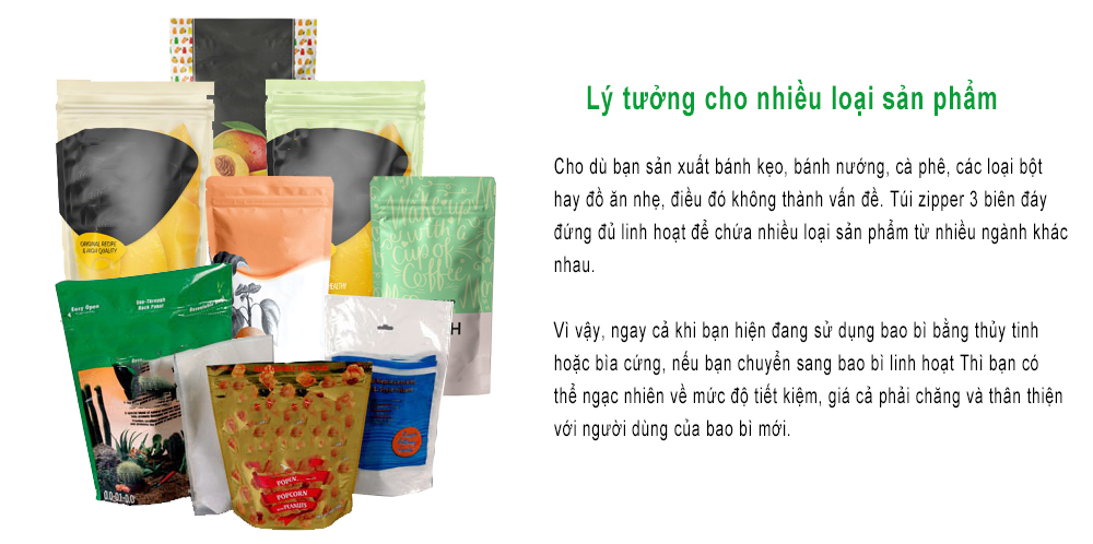 Túi zipper 3 biên đáy đứng là một loại túi màng ghép có nhiều tính năng là lợi ích, vì thế được sử dụng trong nhiều lĩnh vực khác nhau, đặc biệt là ngành thực phẩm. Chúng ta cùng tìm hiểu về cấu tạo cũng như lợi ích của loại túi này nhé.